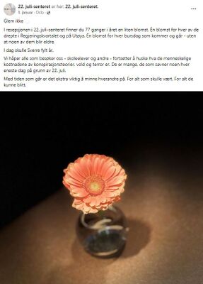 På bursdagen til hvert terroroffer setter 22. juli-senterets ansatte en blomst i resepsjonen, tar bilde av den og legger ut en minnetekst på sin Facebook-side. Her ved bursdagsblomsten satt i resepsjonen 1. januar 2023.[2]