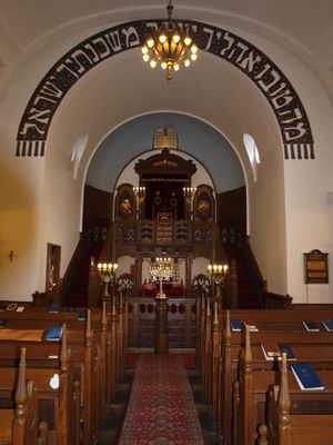 Toraskapet står høyt opp på den avrunda østveggen, med trapp opp fra begge sider. Under dette finner man bima, et podium hvor man leser fra Tora. Prekenen holdes ved toraskapet. Teksten over bua i øst er fra 4. Mosebok 24,5: «Hvor vakre er dine telt Jakob, dine boliger Israel».