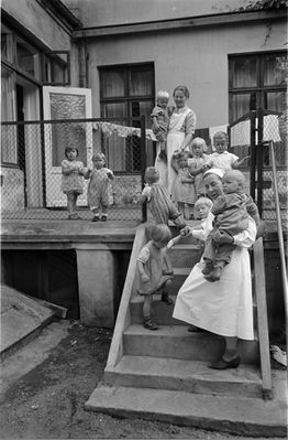 Barn og ansatte ved Tøyenkirkens barnekrybbe i 1941.