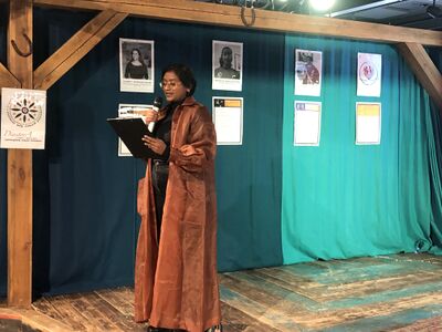 Et par av de portretterte kvinnene var til stede på arrangementet, blant annet student og aktivist Nidarsika Paramalingam (Ninthu). Nidarsika åpnet utstillingen med selvskrevne dikt/spoken word. Det første handlet om rasisme på boligmarkedet; «Fordi en gammel mann med rynker, mener maten vår stinker, sier han at han ikke leier ut til indere mere.» Gjennom diktet ble den tamilske migrasjonshistorien formidlet, og vi fikk høre om en dyktig tamilsk kvinne som sto opp for seg selv. Videre leste hun opp sitt eget dikt ‘Som sola står vi opp’. Nidarsika fortalte her om sin mor, som hun refererte til som «sola»: «Tamilere, vi hyller sola. Vi feirer og takker den. Den gir oss lys, mat, varme og liv. Det er ingen tvil om at amma var min sol, som brenner sterkere enn noe annet, men aldri blir utbrent», sa hun stolt.