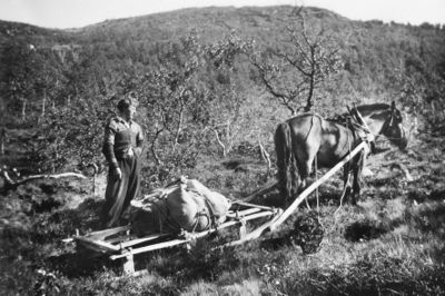 Torleiv T. Stavenes flyttar heim av støylen Takrinden. Hesten Blakken dreg sleden. Biletet er teke i 1941. Kven som var fotograf er ukjent, men biletet er iallfall henta frå samlinga til Torleiv T. Stavenes.