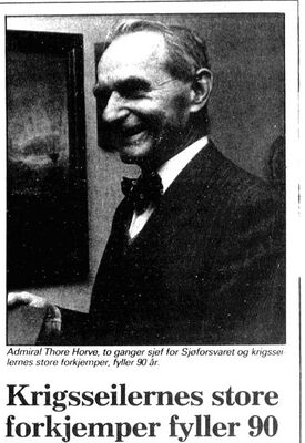 | Admiral Thore Horve var en utrettelig forkjemper for sjøfolkenes ved og vel. Han la all sin prestisje i å få rettet opp den urett han mente var begått mot disse. Han nøt tillit i alle lag av folket og han sparte seg ikke. Uten hans innsats er det grunn til å tro at så vel "Ex Gratia" -saken så vel som dekorasjoner til Handelsflåtens sjøfolk fremdeles ville ha vært uløst. Selv om anerkjennelsene til disse kom sent, for de fleste altfor sent, skylder våre sjøfolk admiral Thore Horve en stor takk for hans innsats. Han ba ikke om en slik takk, beskjeden som han var på egne vegne. Han ville vel neppe ha ment at han fortjente den heller, men han har hovedæren for at våre sjøfolk under Den annen verdenskrig fikk den anerkjennelsen og den oppreisning de så rettelig både fortjente og hadde krav på. | ||