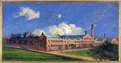 Teatermaler Jens Wangs maleri av anlegget til Maskinhallen på Jubileumsutstillingen på Frogner 1914. Vogn fra Lilleakerbanen i Drammensveien i forkant av anlegget. Veien langs bygningen til høyre er idag Verkstedveien. Den basilikalignende verkstedhallen helt til høyre.