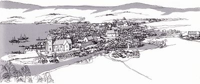 Middelalderens Oslo omkring 1300. Middelalderbyene var små, men deres økonomiske og politiske betydning økte i denne perioden.
