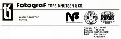 16. september 1972 annonserer Fotograf Tore Knutsen a/s sitt nyåpnede fotoatelier i Håndverkerforeningen i Grimstad. dette var en videreføring av Kristoffer Lommeruds virksomhet.[2] Tore Knutsen drev egen fotoforretning og atelier i Juskestredet i Grimstad. Firmanavn "Fotograf Tore Knutsen & Co" og "TK Foto".[3]