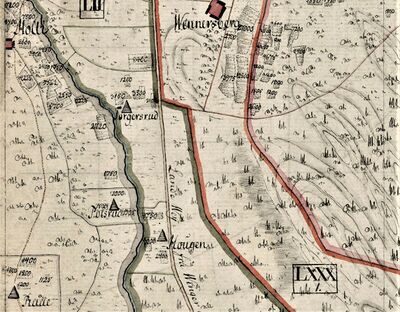 | Torgersrud på kart fra 1781 med Holtplassene Torsrud og Paulsrud i sør. Legg merke til vannhjulet (kverna) i Holtbekken ved Torgersrud. Kartverkets historiske arkiv. | |
