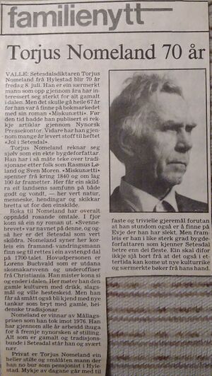 - Sigurd Haugsgjerd: «Torjus Nomeland til minne». Minneord i Setesdølen nr. 98, 2004 side 2.