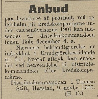 - Tromsø Stifts Distriktskommando fra 1. oktober 1897, (Tromsø). Tromsø Stifts Underofficersskole ble opprettet i Harstad 1899.