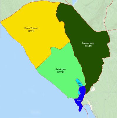 - ↑ Panteregister V-8, pag.85: Utskilt Tryterud skog (bnr.24) av skyldmark 10,28, avh. 29.8.1908, thl.9.9.1908