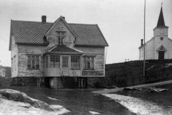 | Bnr 47 Tuften før krigen, gamlekyrkja til høgre. | |