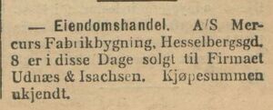 Da Udnæs døde i 1925 ble Olaf Isachsen ene-eier, men drev videre under foranstående logo - inntil firmaet ble omgjort til AS med logoen «UDIS» (Udnæs Isachsen). Ved utgangen av 1920-åra, da firmaet fortsatt hadde flere hundre i arbeid var kontor- og fabrikkadressen Hesselbergs gate. 8, som vi av notisen i Morgenbladet ser at de overtok i 1910.