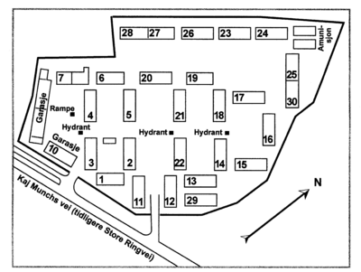 De 22 mannskapsbrakkene var de standardiserte, enetasjes brakkene med grunnflate på 412 kvadratmeter hver. I tillegg til mannskapsbrakkene var syv garasje/verkstedbrakker, et depot samt en lagerbrakke, samt en vakt/kontorbrakke, en sykebrakke og to ammunisjonsbrakker på leirområdet.