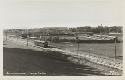 - Sognsvannsbanen på stasjonen ved stadion skal krysse Sognsveien på vei mot Oslo sentrum, Stadion Kro og stadion i bakgrunnen.Foto: Sigurd Gran/Nasjonalbiblioteket (1934-1936).