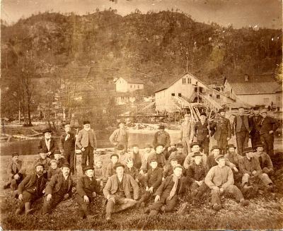 Det eneste bildet med arbeidere ved Undal sagbruk der det finnes navn. Pek på bildet for å få fram navn. Ukjent fotograf/Lindesnes bygdemuseum.