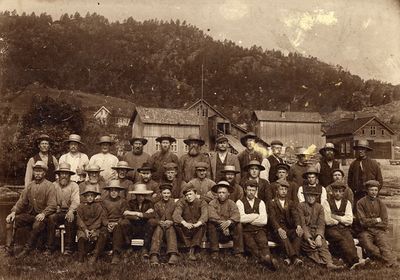 Arbeidere ved Undals sagbruk. Nummer fem fra venstre bakerst: Jørgen Birkestøl. Helt til høyre i midterste rekke Tobias Haga. Bendik Melhus sitter foran nr. fire fra høyre.