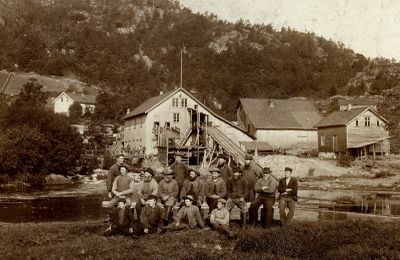 Arbeidere ved Nye Undals sagbruk etter 1910. Navn uten nærmere angivelse av hvem som er hvem: Tobias Buhølen (hos Ingeborg), Rudolf Hagehei, Tobias Roland (Risdal), Johan Bustad, Jørun Birkestøl, Ånen Bustad, Hans Nyvold, Jakob Eiken, Andreas Slettan, Tobias Hagen, Theodor Furuhei. Eneste plasserte: nr to første rad fra venstre er Tobias Berntsen Hage f.1858.