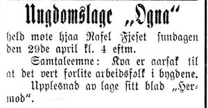 Så skulle man ha navn på lagsavisa, og da kom det til kampvotering, der både «Ungdommens tanke» og «Meningstolken» måtte se seg slått av Hermod. Redaktør av første nummer ble man imidlertid fort enige om at skulle være Kristofer Røli. Og her får vi også ta med at Røli var sønn på Røli som er nabogard med Strugstad, men beliggende i Henning sogn. I 1899 ble han en av medstifterne av Bagabu Ungdomslag og faktisk også dette lagets første formann. Men Vekre har nok ikke likt navnet Hermod, for til første lagsmøte som var 8. mars forelå et brev fra ham der han går sterkt inn for navnet Meningstolken. Men møtet var enstemmig: Hermod skulle avisa heite.