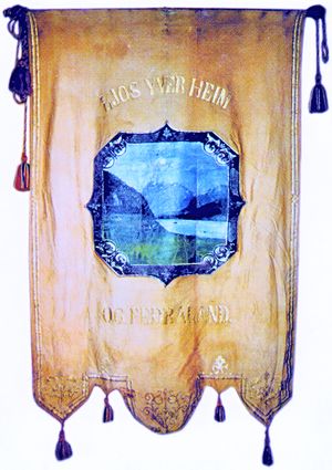 På medlemsmøte på Sør-Bruem 21. september 1902 la Andreas Ryan fram tanken om å gi laget et merke, eller helst en fane. Saka fikk stor åtgaum, men det ble ikke gjort noe vedtak i saken før den igjen ble tatt opp på Meierisalen våren 1903. Da fikk forslaget full støtte og ble enstemmig vedtatt. Til å arbeide med saken, valgtes Ryan, Ole og Andreas Strugstad, Oline Gravås og Otthilie Stenseng. I samme møte ble komiteen pålagt å avvikle en korg- og pakkefest for å skaffe penger til formålet.