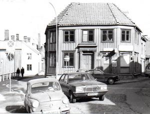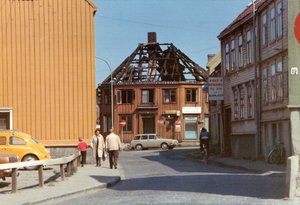 Figur 8,9,10. Huset på Nedre Bakklandet som plutselig brant i 1974. Bilde før brannen (foto Jarle Krokeide, 1973) til venstre, i midten er etter brannen (foto Nils Marstein, 1974) og til høyre er tatt i 2023 (foto Anne Marstein)