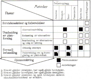 Tabellen viser minimumsmetoder og anbefalte metoder i hoved- og detaljplan prosessen. Den viser at minimumskravet som ble stilt, hovedsakelig var informasjonsplikt og ikke reell samhandling.