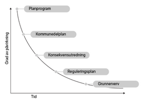 Selve planleggingsprosessen er blitt mer omfattende. Etter vedtatt kommuneplan er det ikke nødvendigvis bare å igangsette reguleringsplan. Det er utarbeidet flere krav som fastsetter at det må utarbeides egen konsekvensutredning. Det innebærer at konsekvensutredning må vedtas av kommunestyret før selve reguleringsplanarbeidet kan påbegynnes. Forut for konsekvensutredningen skal det også foreligge et planprogram som også skal vedtas av kommunestyret. Gjennom planprogrammet kan det også stille krav om at det skal foreligge en vedtatt kommunedelplan før videre planlegging igangsettes. Det viser at planprosessene i dag er langt mer omfattende enn tidligere. For å få bevilging fra Stortinget til bygging av ny statlig veg, kreves det at det foreligger vedtatt reguleringsplan. Tidligere, dvs. før 2000, var det det krav om godkjent hovedplan vedtatt av Vegdirektoratet.