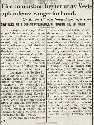- «Fire mannskor bryter ut av Vestoplandenes Sangerforbund» i avisa Hadeland 17. januar 1939. Digital versjon på Nettbiblioteket.