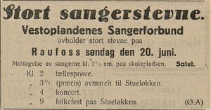 Vestoplandenes Sangerforbund annonserte for sangerstevnet i Gjøvik 10. juni 1938 i avisa Vestopland 12. juni 1938.