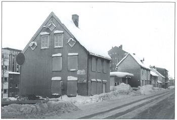 Nærmest ser vi Vestregata 15, ganske lukket og låst. Bak ligger bensinstasjonen i Vestregata 13a, også den ser temmelig stengt ut på dette tidspunktet.