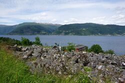 Steinrøys om lag der gamleskulen på Fedjane stod før i tida. Dagens Feios skule er det røde bygget lenger ned Foto: Pauline Eckerlein / Sogn og Fjordane fylkeskommune