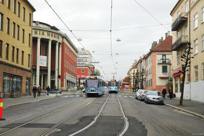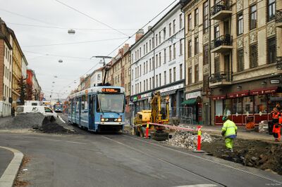 Vogts gate ovenfor Bentsebrugata med trikker type SL79 på midlertidig enkeltsporet strekning. Oppgradering av sporet pågår.