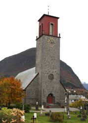 Anna informasjon: Tredje kyrkja på staden sidan omlag 1200. Den førre brann natt til 7. april 1929.