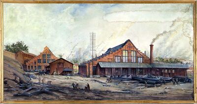 Maleri av Vulkan sett mot nord til Maskinhallen på Jubileumsutstillingen på Frogner 1914.