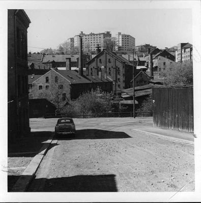 - Industritomta sett fra Grünerbrua før Vulkan: Bagaas Brug med Bagaas Badehus, på den høyre bredden ligger Nedre Foss mølle.Foto: Norsk Teknisk Museum (ant. 1866).