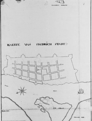 Kart over Christiania og Akershus festning av Willem Coucheron, ca. 1655. Forslag til utvidelse av byen med tre kvartalsrekker mot fjorden og utvidelse av festningen. Kart i Det. Kgl. Bibliotek, København