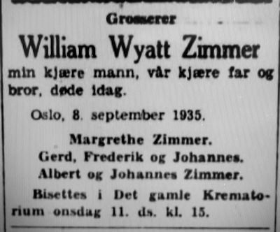 - Aftenposten 9. september 1935, dødsannonse for Zimmer.