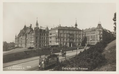 Haffner levde sine siste rundt 20 år i den prominente leiegården i Drammensveien 2, midt på bildet, her med Victoria terrasse fra 1880-åra bak, Triangelplassen fram mot gata og Slottsparken på den andre siden.